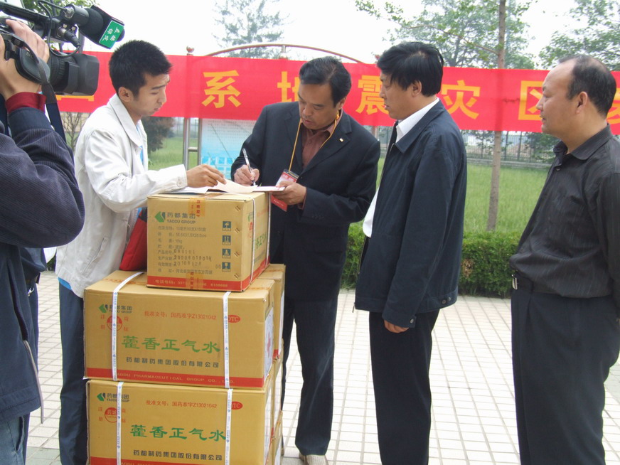 2008年5月16日,藥都集團(tuán)向四川地震災(zāi)區(qū)捐獻(xiàn)的價(jià)值100萬元的藥品通過保定市紅十字會(huì)發(fā)往災(zāi)區(qū)。16日上午保定市紅十字會(huì)彭秘書長一行來我集團(tuán)辦理捐贈(zèng)藥品的交接手續(xù),安國市副市長張彥安參加了交接儀式。在簡短的交接儀式后,載滿藥都集團(tuán)全體員工救災(zāi)熱情的藥品捐贈(zèng)車立即開往保定火車站。