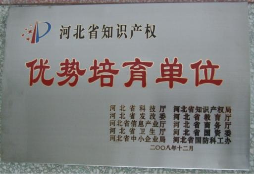 2008年12月,我公司被河北省科技廳、河北省知識產(chǎn)權局、河北省發(fā)改委、河北省教育廳、河北省信息產(chǎn)業(yè)廳、河北省商務廳、河北省衛(wèi)生廳、河北省國資委、河北省中小企業(yè)局、河北省國防科工辦評為“河北省知識產(chǎn)權優(yōu)勢培育單位”。