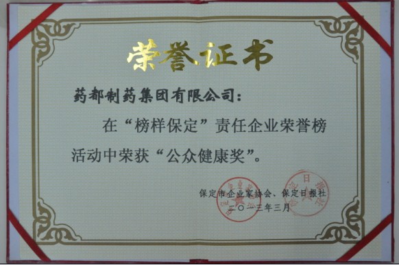 2013年3月29日,保定市工業(yè)和信息化局發(fā)布了評審結(jié)果,我公司在“榜樣保定”責(zé)任企業(yè)榮譽榜活動中榮獲“公眾健康獎”。