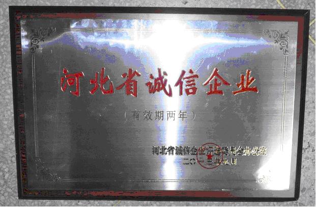 2013年9月27日,河北省誠(chéng)信企業(yè)評(píng)選委員會(huì)在省會(huì)石家莊召開(kāi)了2013年度誠(chéng)信企業(yè)表彰大會(huì),對(duì)榮獲2013年河北省誠(chéng)信企業(yè)進(jìn)行了表彰 (冀誠(chéng)企評(píng)辦[2013]16號(hào)),我公司連續(xù)被評(píng)為“河北省誠(chéng)信企業(yè)”。