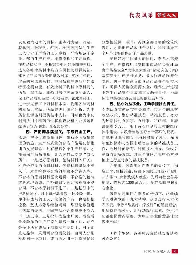 李龍,保定市人大代表,藥都制藥集團(tuán)股份有限公司總經(jīng)理。一直以來,他都非常珍惜人大代表這一榮譽(yù), 始終牢記人大代表的使命,自覺踐行人大代表的職責(zé),在經(jīng)營好企業(yè)的同時(shí),始終把自己放在為廣大群眾代 言的位置,不負(fù)群眾的信任和重托,認(rèn)真履行人大代表的神圣職責(zé),做到情為群眾所系,利為群眾所謀,用 自己的真情和汗水贏得群眾的信任和贊譽(yù)。